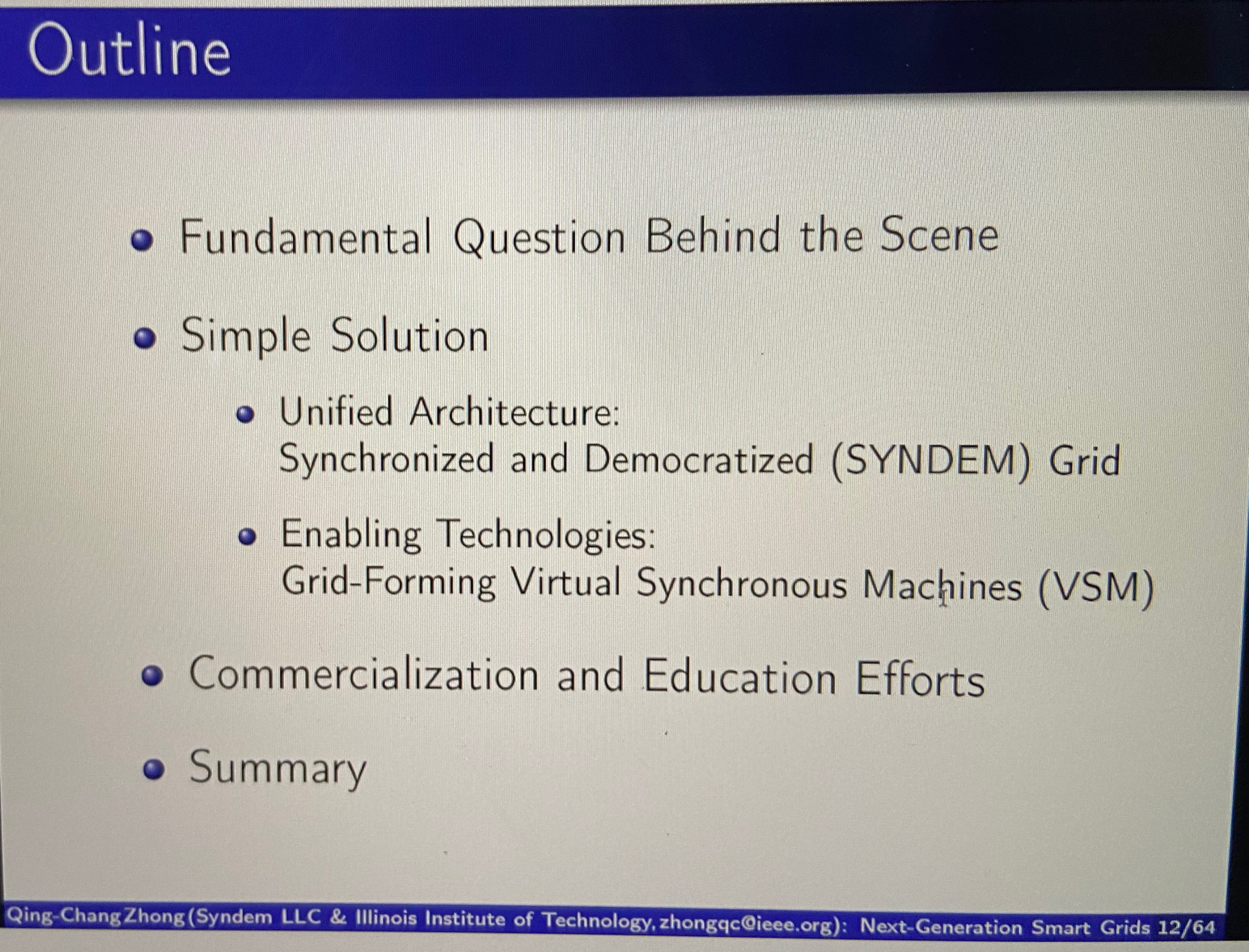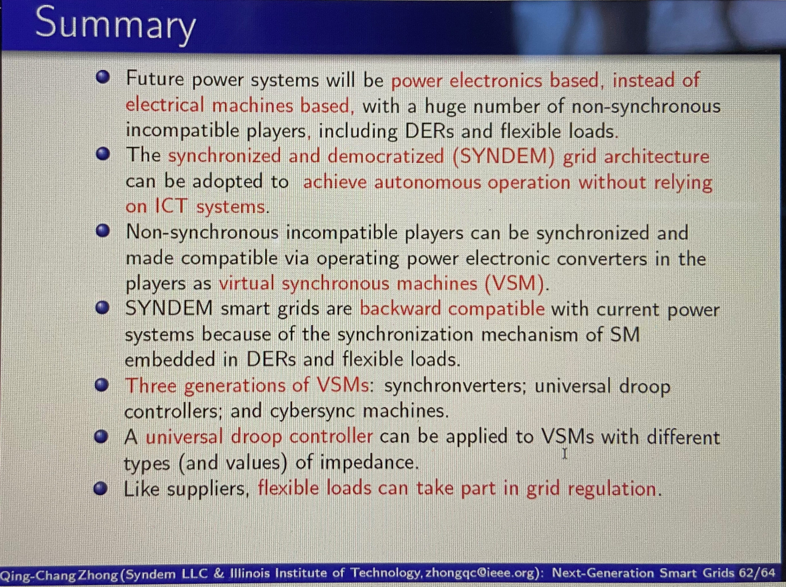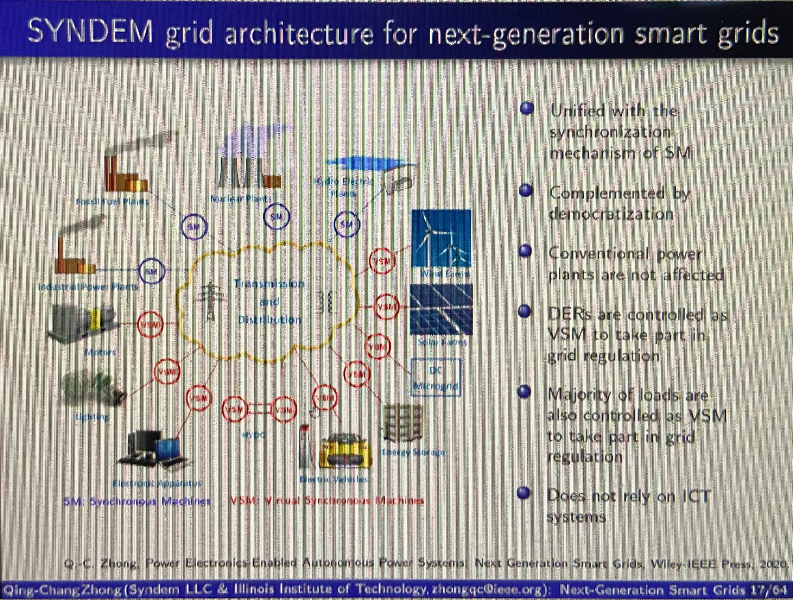 On June 22nd, IEEE (PI)2 Austin hosted a virtual and in-person Technical Meeting entitled “Power-Electronics-Enabled Autonomous Power Systems: Next-Generation Smart Grids” Dr. Qing-Chang Zhong of the Illinois Institute of Technology, Chicago, a Distinguished Lecturer of three IEEE Societies discussed his research and vision that future power systems will be power-electronics-enabled with millions of heterogeneous active players, rather than electric-machines-based with thousands of homogeneous generators. Dr. Zhong discussed a holistic grid architecture, which he referred to as the SYNDEM (synchronized and democratized) grid architecture, together with its technical routes, which will accelerate a paradigm shift and harmonize future power systems. He explained that millions of power-electronics-enabled active players, large or small, supplying or consuming, can be controlled to behave like virtual synchronous machines so that they can equally, autonomously, and actively take part in the regulation of system frequency and voltage. Moreover, he stated that the communication infrastructure can be released from the low-level control of power systems, opening up the prospect of achieving autonomous operation for future power systems without relying on communication networks. Dr. Zhong concluded that this holistic solution could considerably enhance the stability, scalability, operability, security, reliability and resiliency of the next-generation smart grid.